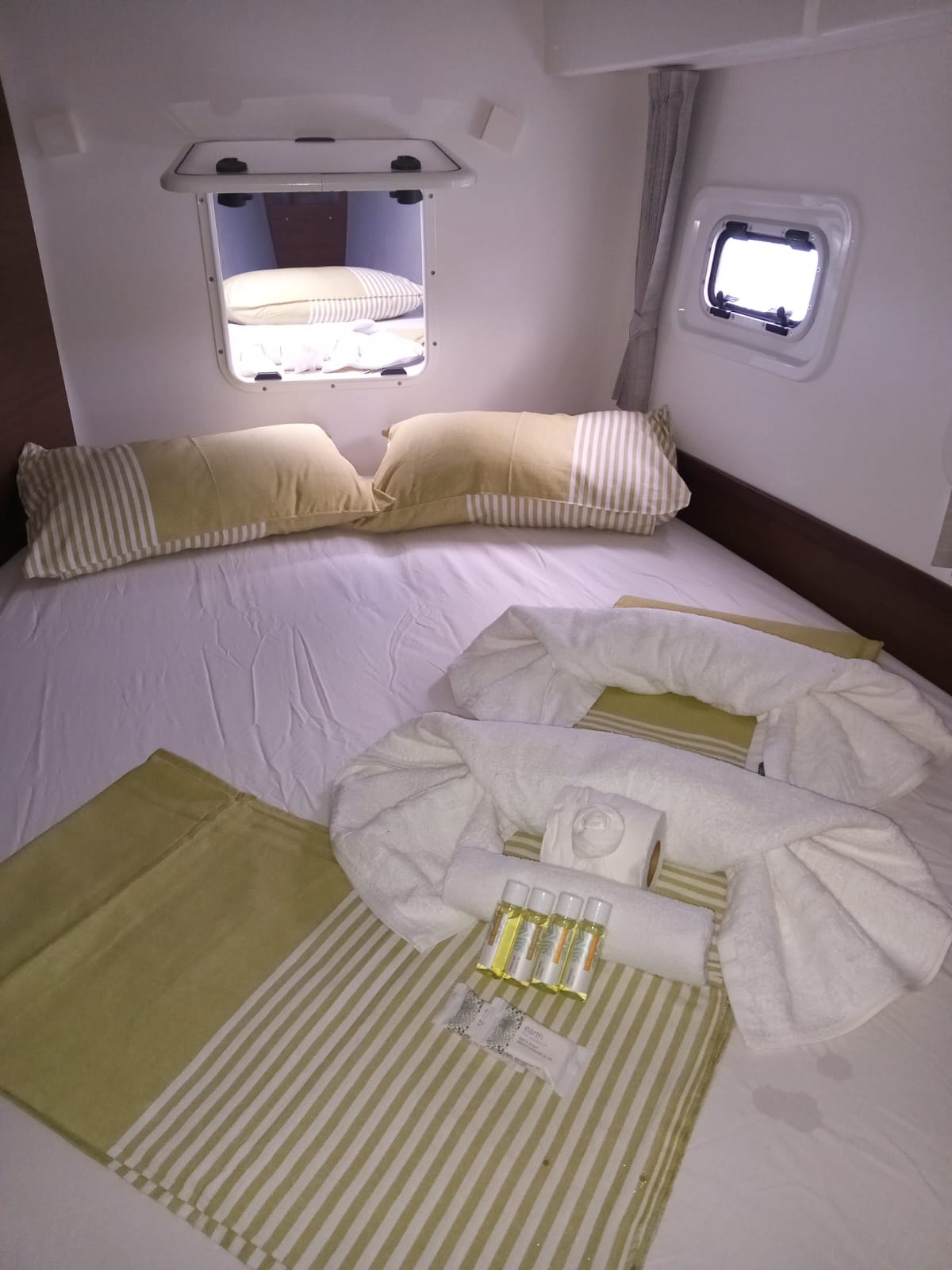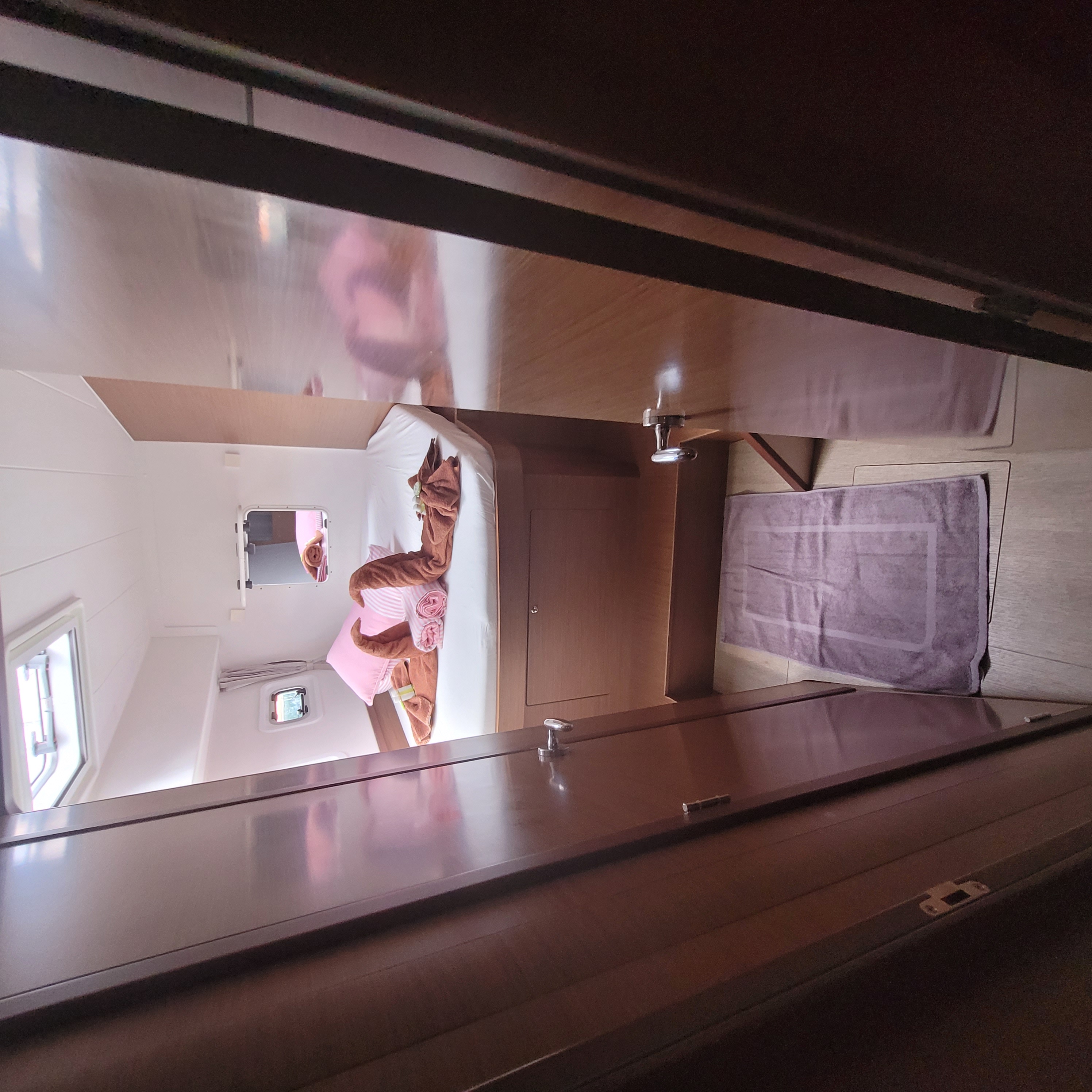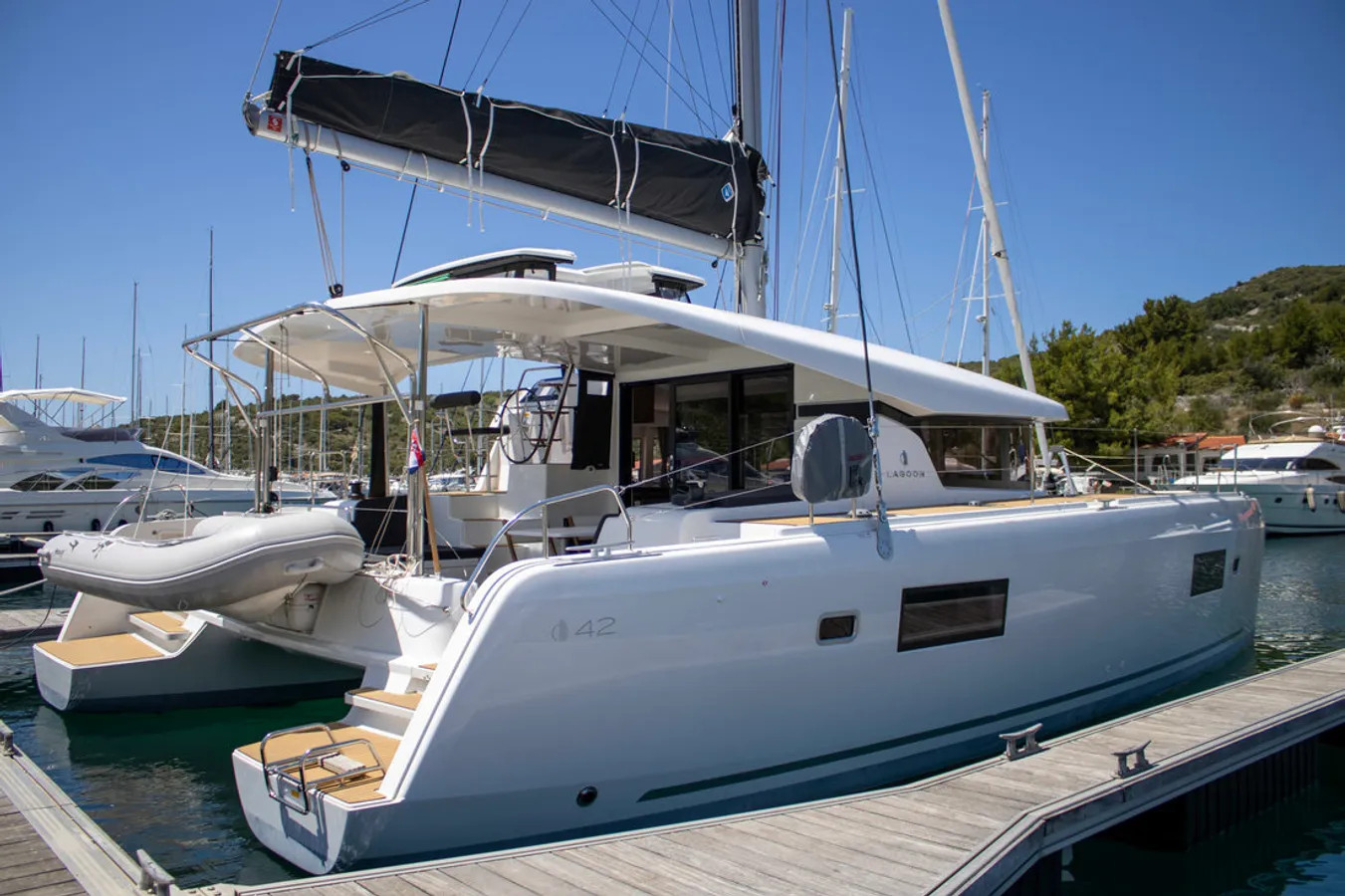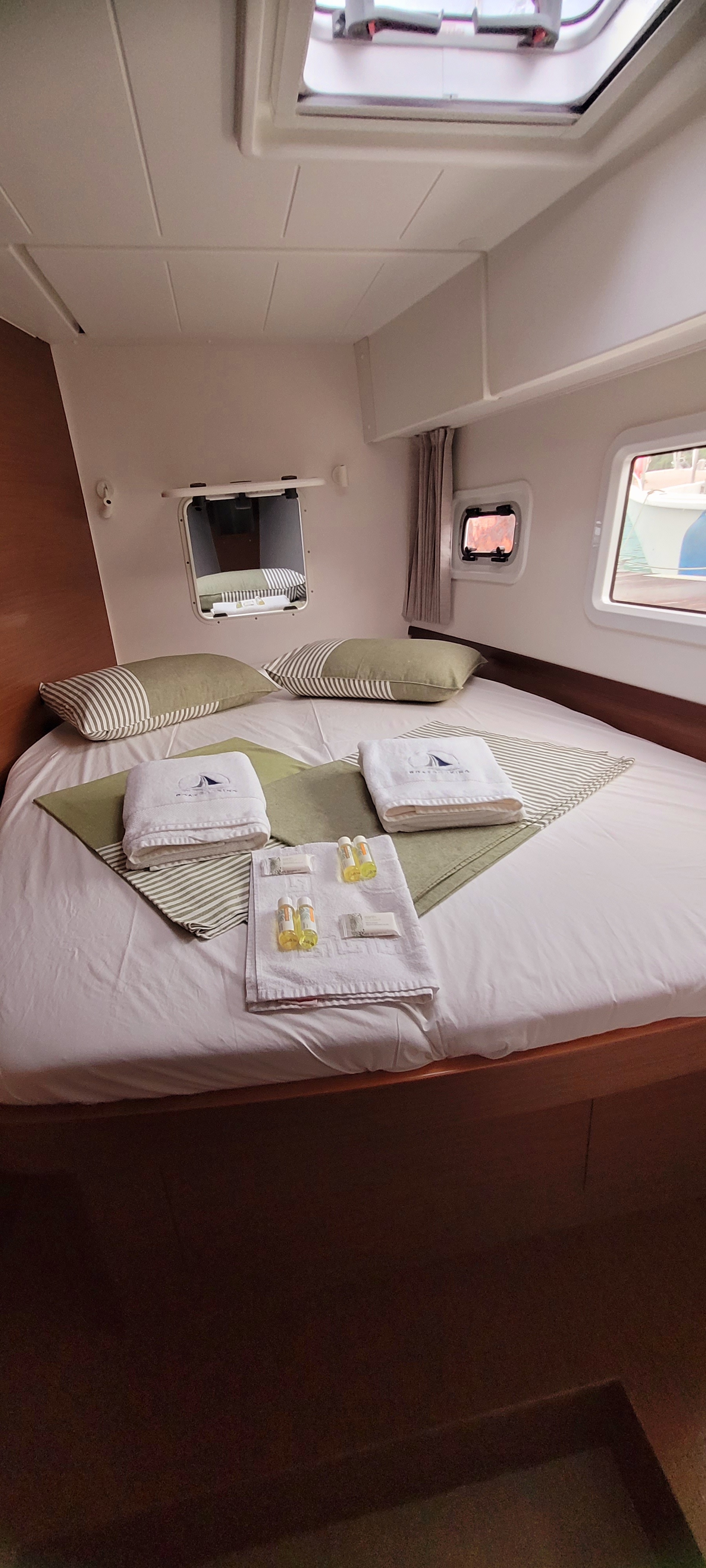 Accommodating up to 10 guests in 4 double cabins, 2 forward skipper cabins, and an extra convertible double bed in the saloon, the DH550 offers generous space for everyone on board. She features two helm stations for easy navigation and was upgraded in 2025 with an additional outside helm station, where up to five people can enjoy the stunning views while sailing.